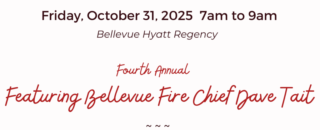 Join us for an engaging morning in support of the Bellevue Fire Department. Meet and hear from our new Fire Chief Dave Tait and the dedicated men and women who respond to our calls for help. Gain valuable insights into Bellevue’s fire service and its impact on our community.